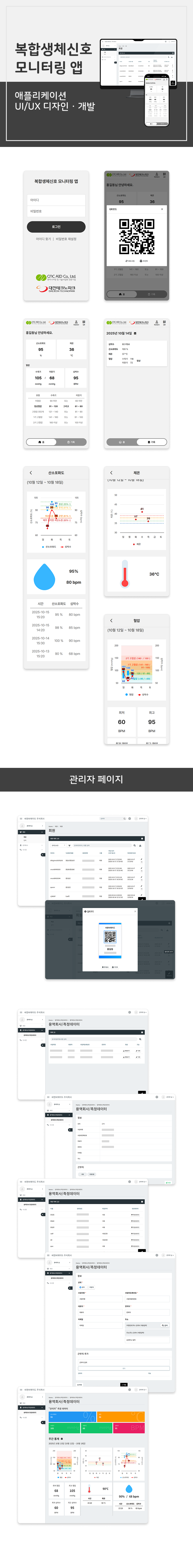 관리자는 웹 기반 관리자 페이지에서 사원을 등록하고 QR 사원증을 발급하며, 근로자는 QR 사원증을 통해 현장에서 혈압, 산소포화도, 알코올 수치를 간편하게 측정할 수 있습니다.